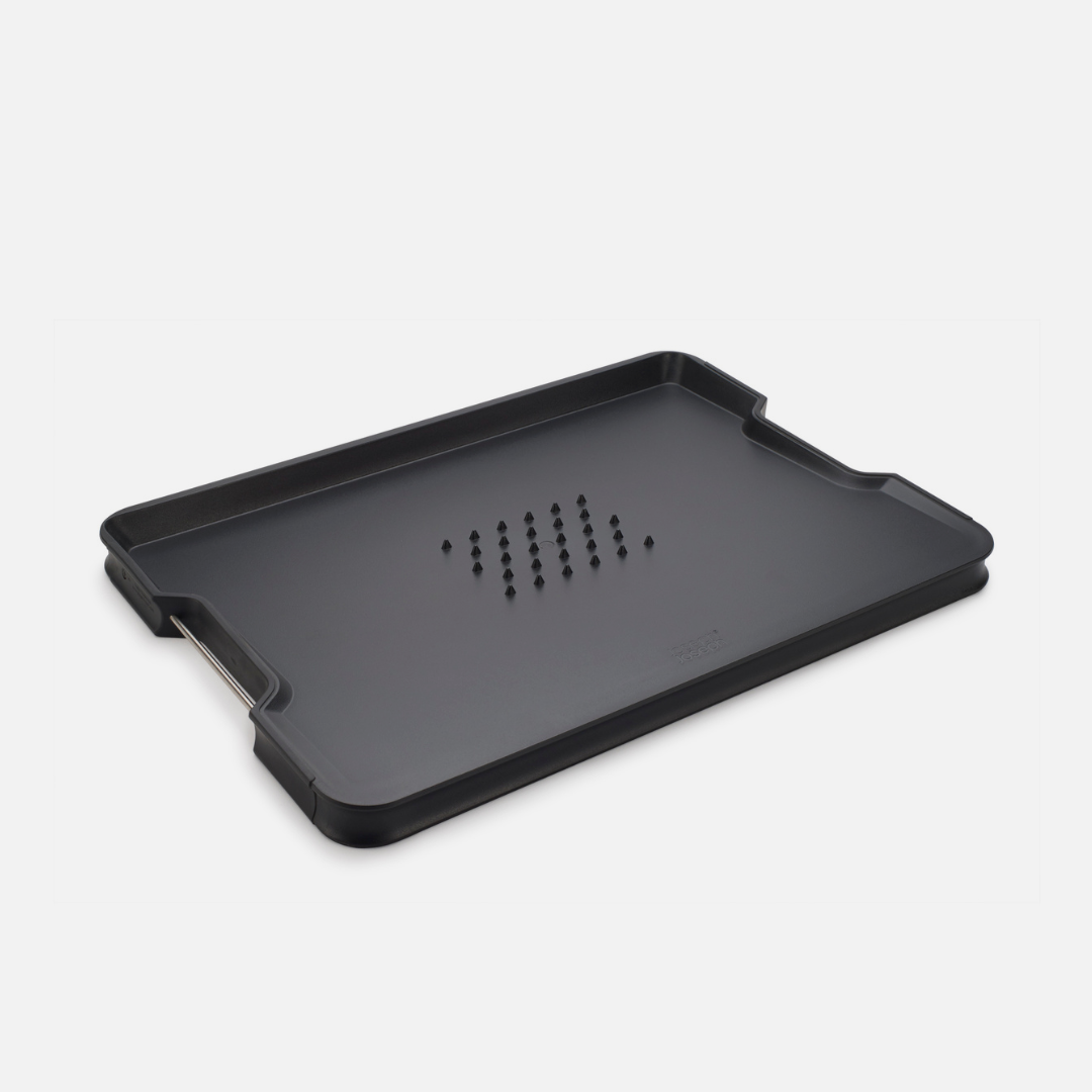 Cut&Carve™ Plus serves up multiple uses in one design. One side features an integrated meat grip for extra help with carving while the other provides a smooth cutting surface for all other types of food prep. Other clever details include an angled base, raised edges and easy-pour corners for collecting and disposing of crumbs and liquids. If a Sunday roast is on the menu, you’ll want Cut&Carve™ Plus on the worktop.